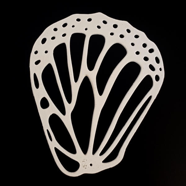 Cluster is a set of connected 3D modeled and printed monarch butterfly wings. Similar to the work Roost, the fragile wings congregate for survival. As monarch butterflies decrease in numbers caused by environmental changes, the 3D printed work called Lone Wing becomes a symbol for what could be one day a reality.