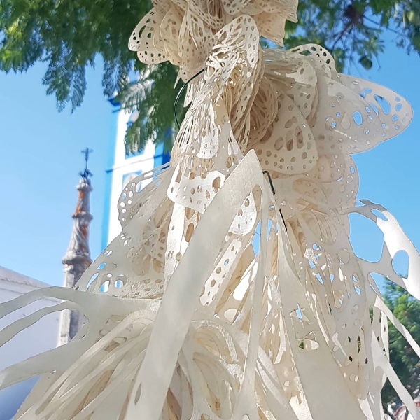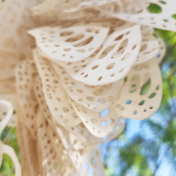 Hundreds of laser cut cotton wings are hung together in a bunch to mimic how monarch butterflies come together to form what is called a roost. Monarchs roost at night during migration and when they go through diapause, a hibernation-like state, during the winter season. They can be found in handfuls and up to tens of thousands on one tree alone. The largest congregations happen when they overwinter in the mountain areas in the southern states and Mexico in oyamel fir forests. Roost hung in a tree during my exhibition Our Foreign Backyard in Portugal to represent the wings that will not roost again due to their decline caused by climate change.